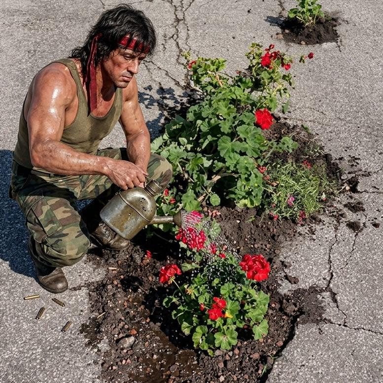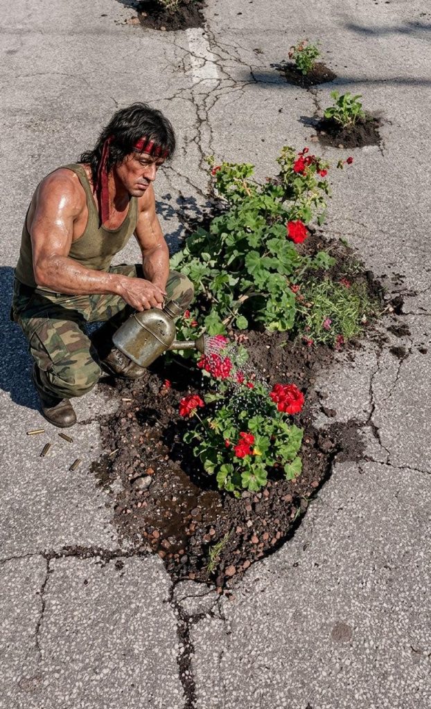 τη φωτογραφία πάντως βλέπουμε το Plan B σε περίπτωση που το μηχάνημα πάθει βλάβη (ή αν τελειώσουν οι προκαταβολές σε ΗΜΕΤΈΡΟΥΣ): Ο Ράμπο σε μια συγκλονιστική προσπάθεια να σώσει το τελευταίο ίχνος πολιτισμού μέσα από τις τρύπες της ασφάλτου.