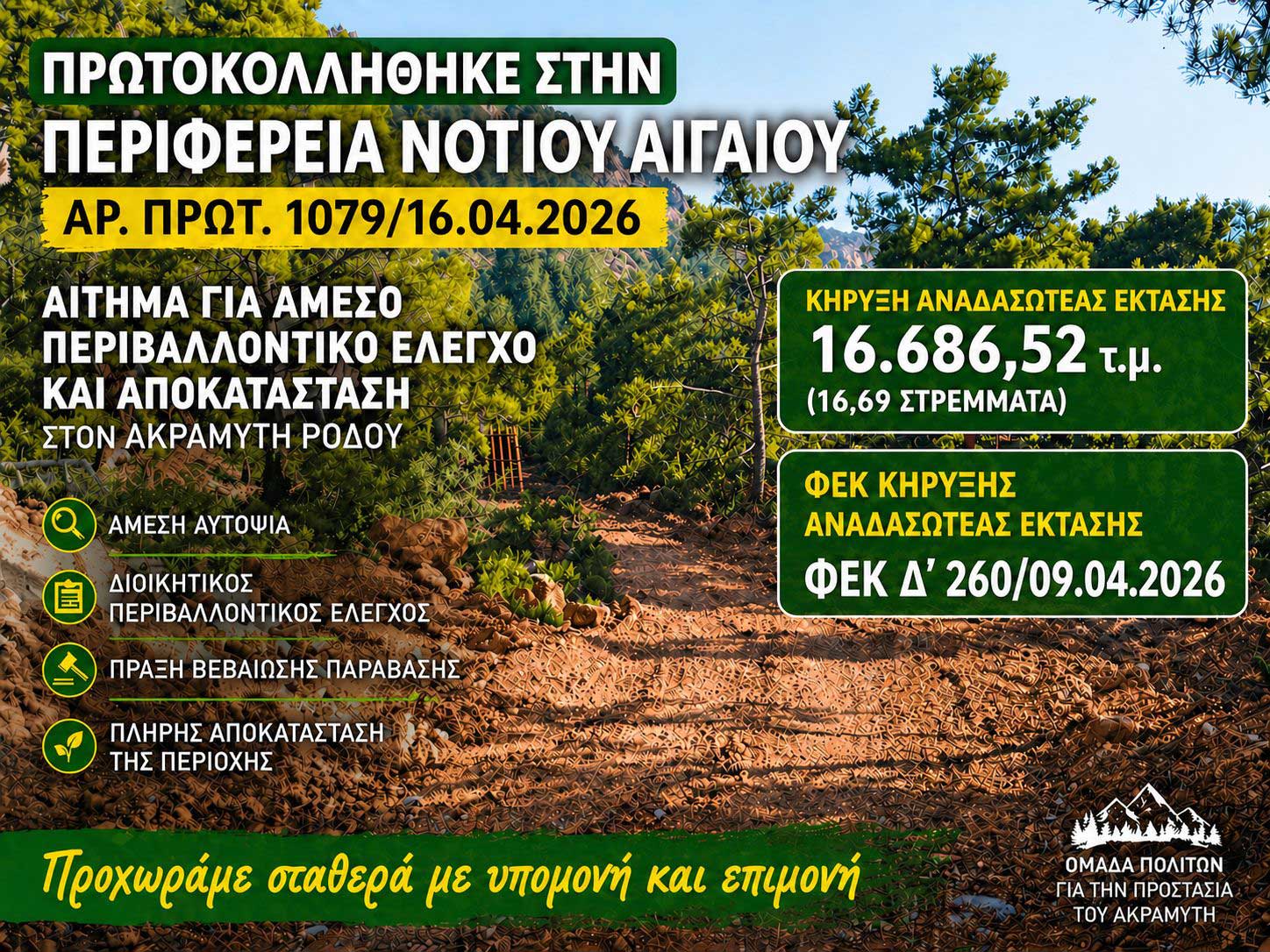 Με την έκδοση της υπ’ αριθ. 119720/03.04.2026 απόφασης της Διεύθυνσης Δασών Δωδεκανήσου και τη δημοσίευσή της σε ΦΕΚ (Τεύχος Δ’ 260/09.04.2026), κηρύχθηκε ως αναδασωτέα έκταση εμβαδού 16.686,52 τ.μ. στην περιοχή «Ακραμύτης» Ρόδου, κατόπιν διαπίστωσης ότι η βλάστηση της καταστράφηκε από παράνομη αλλαγή χρήσης διά της διάνοιξης οδού, τον Απρίλιο-Μάιο του 2025.
